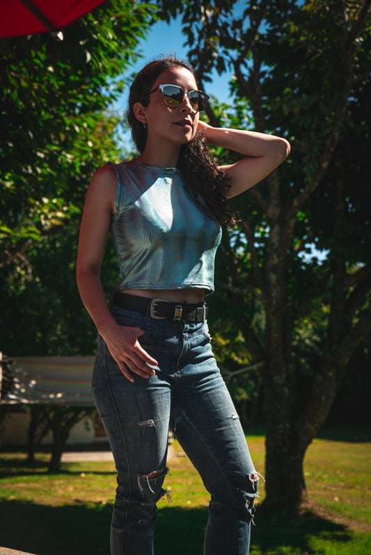 CROP TOP CUELLO ALTO METALIZADO.